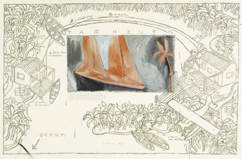 "Jean de Loisy: During this period, you kept a logbook of sketches with portraits of your crewmembers and your rivals, as well as your boats, but it was only during the last stage of the preparations for your big schooner that painting reemerged. Then literary references came back, namely to your fetish book The Devil to Pay in the Backlands, by Brazilian writer João Guimarães Rosa. On the canvases a rhizome is represented, a big decorative form made up of curves and reverse curves, blending allusions to Guimarães Rosa’ sertão (backlands) universe with piracy, elements from your personal history, and also a few silhouettes of vahines that bring Gauguin to mind. The novel, your experience and your inclinations transformed into paintings of a fantasy world…